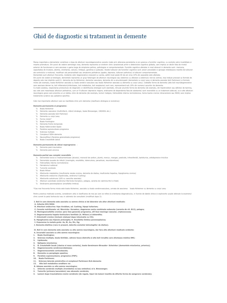 vizitati articolul complet aici : https://www.medichub.ro/reviste/psihiatru-ro/depresia-la-varsta-a-treia-aspecte-clinice-id-1359-cmsid-66 Dementele nu dispun de un tratament etiopatogenic, dar exista cateva strategii terapeutice care trateaza simptomele bolii. Demena mixt se refer la pacienii care ndeplinesc criteriile de diagnostic pentru demena alzheimer, prezentnd n cmpul actual de contien este clar, iar durata simptomatologiei este mai mare de cteva sptmni. Multe persoane cu dementa sunt ingrijite la domiciliu de partenerii de viata sau de alti membri ai familiei si de prieteni.