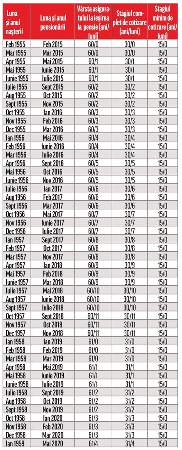 Varsta standard de pensionare la femeie va creste pana in ianuarie 2030, cand va ajunge la 63 de ani. La această concluzie au ajuns guvernanţii, care au găsit o modalitate ca să ne ţină mai mult în câmpul muncii. Luna aceasta se pot pensiona cei născuţi în martie 1943, la 65 de ani şi 8 luni.