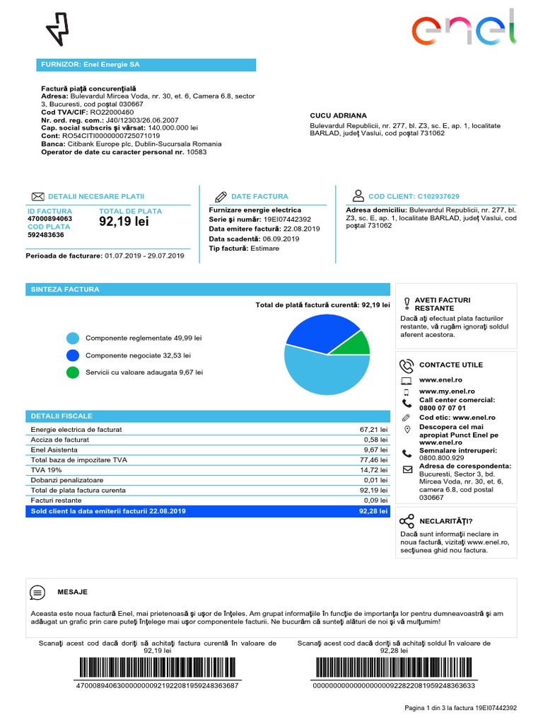 L'operatore enel molto gentile mi ha richiamato il pomeriggio e mi ha dato appuntamento questa mattina per una verifica del contatore e la consegna dei verbali di sostituzione, mi ha fatto notare che anche loro devono. 126, sector 3, bucuresti, cod poștal 030443, cod loc consum 5004918824, tip pret final tarif reglementat, nivel tensiune punct delimitare jt, perioada de comunicare index autocitit. Telefónica argentina ahora se llama movistar.